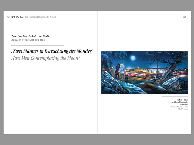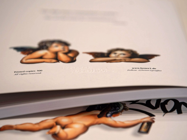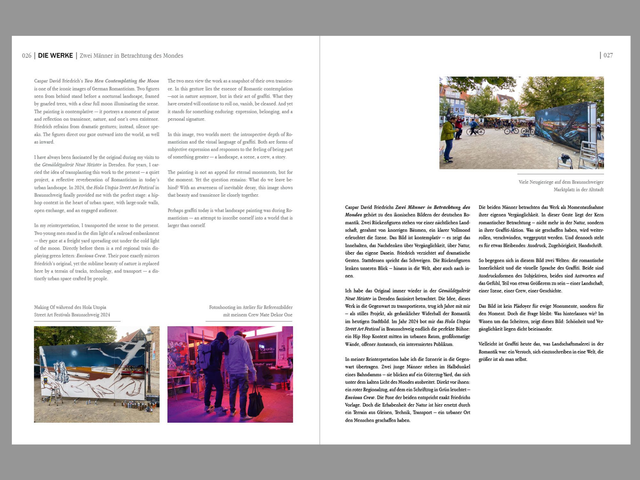 Neben Bildstrecken enthält der Katalog persönliche Texte des Künstlers, erweiterte Katalogtexte zu jedem Werk und Reflexionen zur Rolle von Graffiti und Street-Art im öffentlichen Raum.