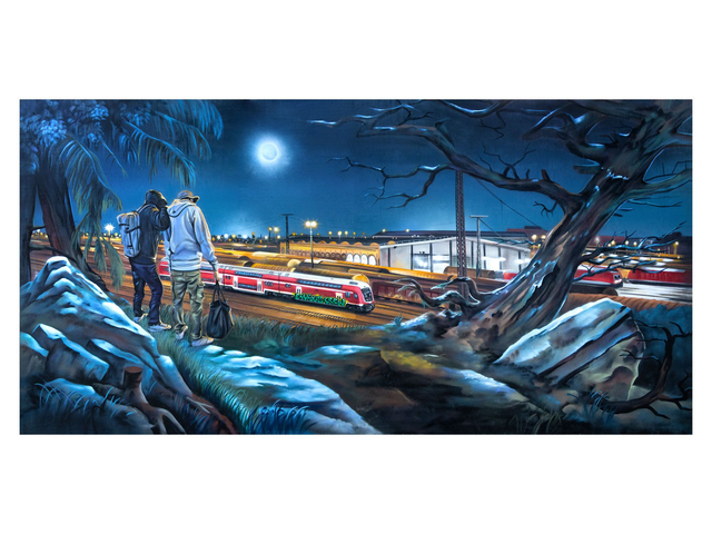 Ein Fine-Art-Gicleé-Print meiner Neufassung von „Zwei Männer in Betrachtung des Mondes“ — atmosphärisch und zugleich urban: zwei Rückenfiguren, die im Mondlicht nicht nur die Landschaft, sondern ihre hinterlassenen Spuren betrachten.